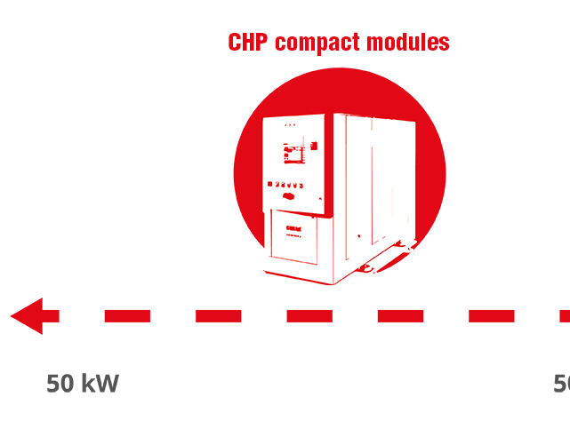 In an exhaust gas heat exchanger, the hot exhaust gas from the CHP engines or CHP gas turbines is cooled, in the process heating water, a water-glycol mixture or thermal oil. This thermal energy can be used in a local or district heating system or for other industrial purposes.